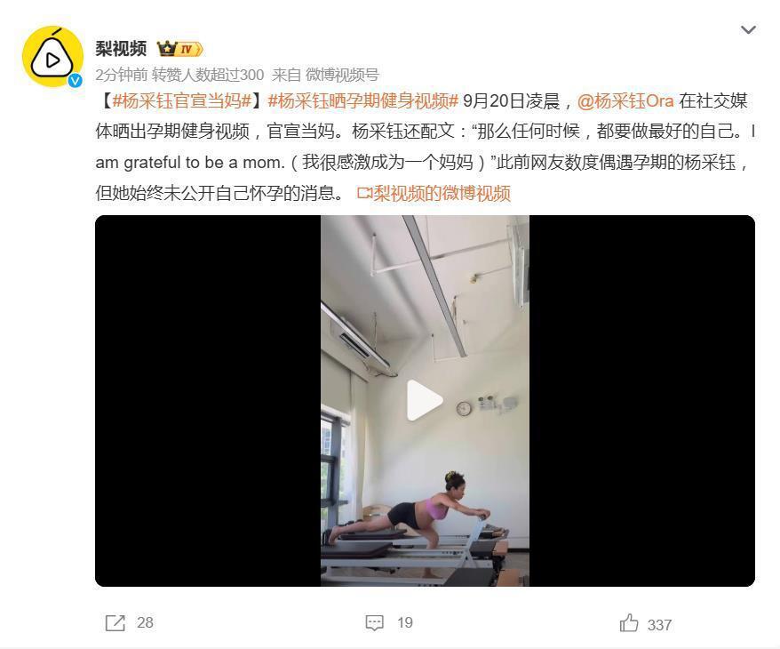 9 月 20 日凌晨,演员杨采钰在社交媒体突然扔出一枚“幸福炸弹”——正式官宣成为母亲。她没有选择晒娃,而是别出心裁地发布了一段自己在孕期坚持健身的视频,瞬间引爆全网。视频中,她挺着明显孕肚,仍在专业指导下进行训练,配文写道:“任何时候,都要做最好的自己。I am grateful to be a mom。”这份自律与活力,被网友盛赞为“新时代妈妈的态度宣言”。